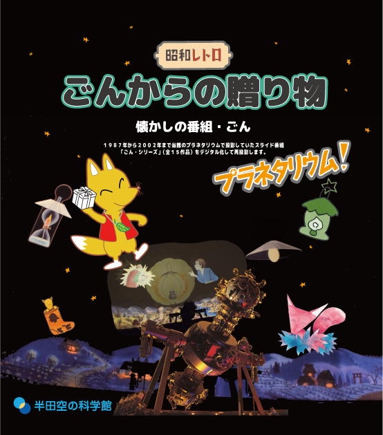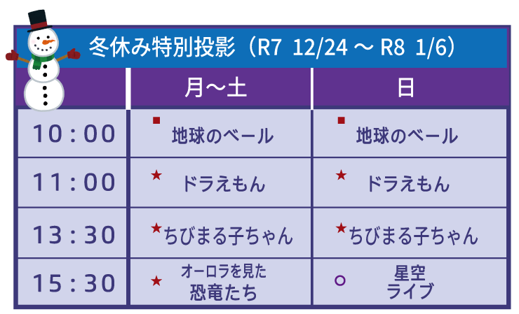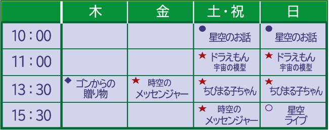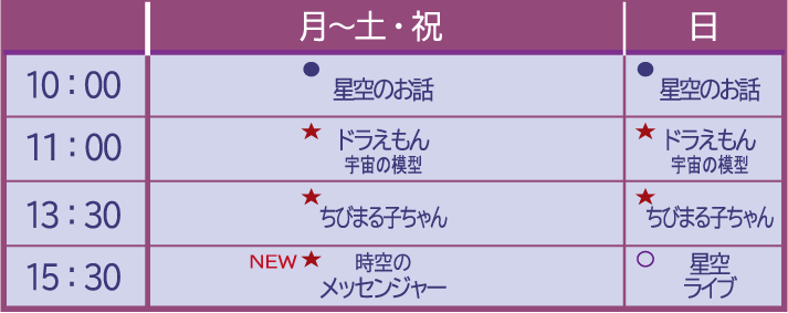 日 | 地球のべーる![]() 大人220円 小人110円 番組のみ 10時~(約30分) | ドラえもん![]() 大人500円 小人200円 星空解説+番組 11時~(約50分) | ちびまる子ちゃん![]() 大人500円 小人200円 星空解説+番組 13時半~(約50分) | 星空ライブ![]() 大人220円 小人110円 全編生解説 15時半~(約50分) |