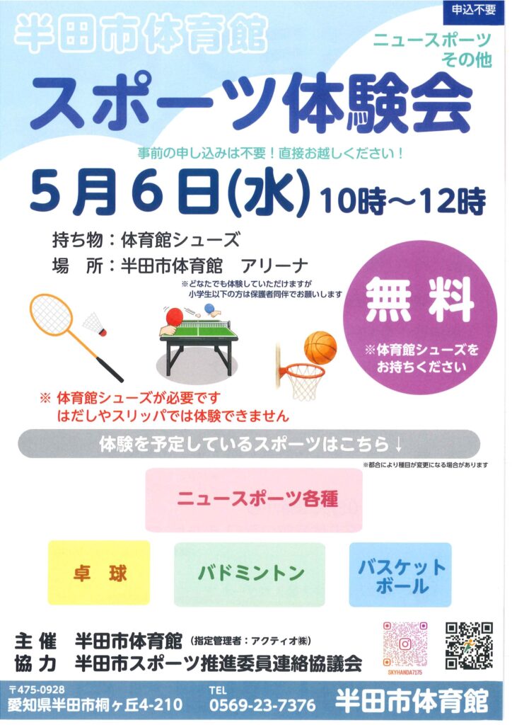 事前申し込み不要、当日どなたでも体験いただけます。ニュースポーツなど様々なスポーツを体験してみましょう!